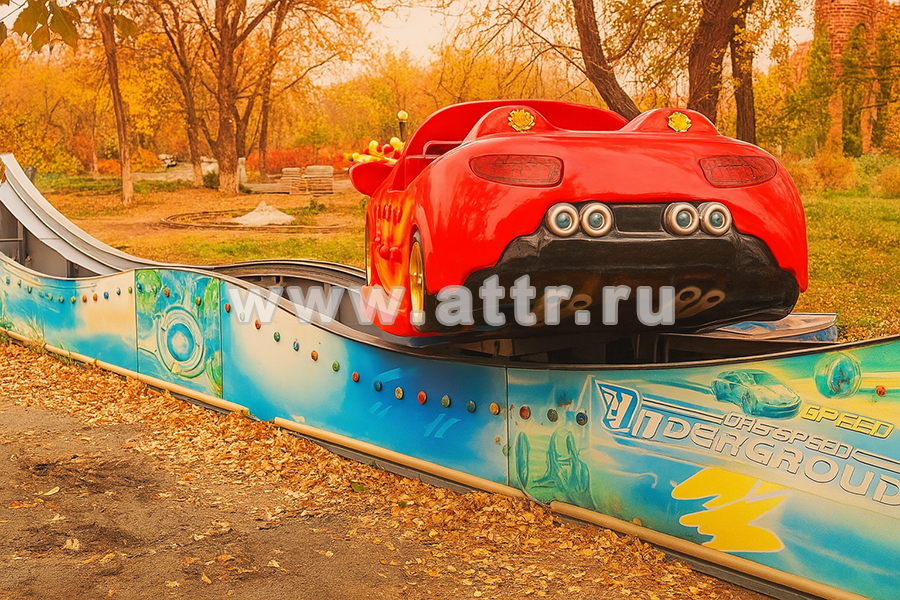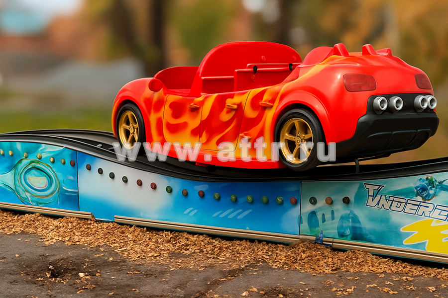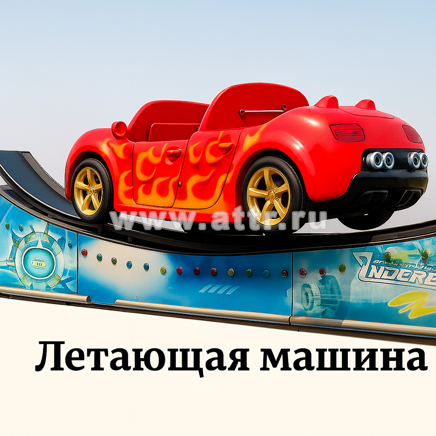 Механический аттракцион "Летающая машина" — эффектный парковый аттракцион с динамичной анимацией и ярким дизайном в виде пылающего спорткара. Он перемещается по волнообразным рельсам, имитируя полёт и лёгкую встряску, что делает поездку увлекательной для детей и подростков.